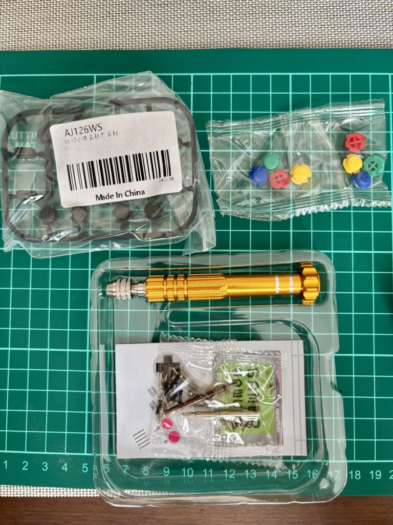 カラー付きボタン、ネジ、Y字・+ドライバー付き。