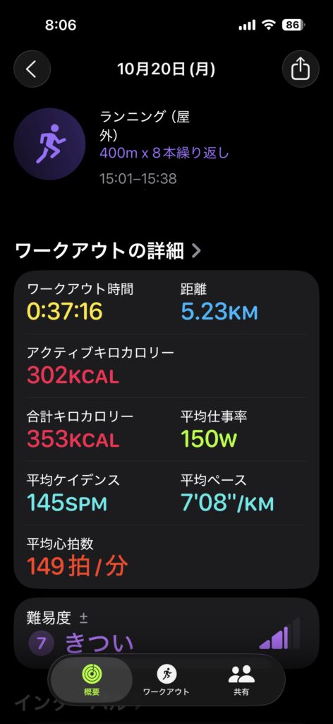 まずは、インターバル走 ※速い区間(高負荷)とゆるい区間(回復)を交互に繰り返す練習走(内容は400m×5分40秒ペースを8本 レストは200m歩く)